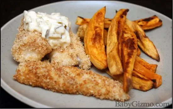 For this St. Patrick’s Day, I thought I would share a “recipe” (I use that term loosely) for healthified crunchy fish (or chicken) and baked sweet potato chips. Perfect for little fingers – and delicious enough for grown-up tastes.